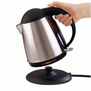 Handsomely constructed of high-quality brushed stainless steel with black accents, this electric teakettle offers a 1-3/4-quart water capacity and boils water faster than microwave or stovetop methods. The teakettle's powerful 1500-watt heating element sits hidden beneath the stainless floor of the unit, so it's never in contact with water, eliminating build-up of mineral deposits and allowing for easy cleanup. Its revolutionary cordless design allows the kettle to be lifted from its base for convenient filling and serving. For safety, the kettle provides automatic shut-off, boil-dry safety protection, and a secure locking lid. Other highlights include a convenient water-level gauge built into the handle and a cord that wraps neatly into the base for easy storage. The teakettle measures 9 by 7-1/2 by 10 inches and carries a one-year limited warranty.